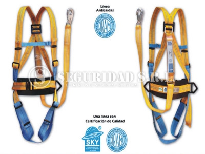 • Arnes completo tipo paracaidista, fabricado en cinta poliester alta tenacidad, esta formado por una banda de cintura con protector lumbar de goma de alta densidad y una hebilla de cierre en el frente