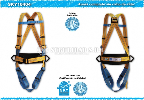 - Arnes completo tipo paracaidista, fabricado en cinta poliester alta tenacidad, esta formado por una banda de cintura con protector lumbar de goma de alta densidad y una hebilla de cierre en el frente. Posee bandas accesorias en hombros y piernas con regule ultra rapido formado por hebillas autobloqueantes. Un punto de anclaje anticaidas dorsal formado por una argolla tipo " D" forjada, en la cintura posee dos puntos de anclaje para sujecion formados por argolla " D" en cada uno de los laterales