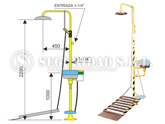 - COLOR AMARILLO. CAMPANA DE DUCHA DE DIAMETRO 220 mm CONSTRUIDA EN ACERO INOXIDABLE TIPO DILUVIO, CON BAFLE ALIVIADOR QUE PRODUCE UNA CAMPANA DE AGUA DE DIAMETRO 500 mm LAVAOJOS CONSTRUIDO CON BACHA DE ACERO INOXIDABLE DE DIAMETRO 250 mm CON TAPA PLASTICA REBATIBLE AUTOMATICAMENTE Y ROCIADORES DE BRONCE CROMADOS QUE PRODUCEN ESPUMA CON EFECTO DE LAVAOJOS Y LAVACARA POSEE PASO CALIBRADO REGULADOR DE PRESION