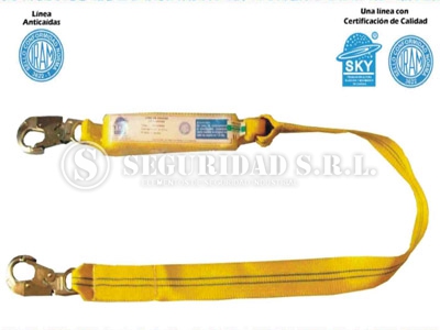 - Cabo de amarre anticaidas confeccionado en cinta polyester alta tenacidad de 50 mm. de ancho y 1, 5 mts de longitud. Posee amortiguador de caidas que disminuye la fuerza de impacto en caso de caida y dos mosquetones de acero forjado de abertura 25 mm doble traba de seguridad, en cada uno de sus extremos